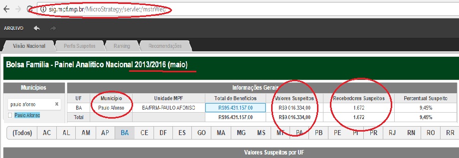 Paulo Afonso – De acordo com o projeto, Paulo Afonso foi um dos municípios que repassou mais recursos para perfis suspeitos, ficou em 16º na Bahia. O resultado aponta que R$ 9.016.334,00 foram dirigidos a 1672 beneficiários que devem ter seu cadastro revisado, por recomendações do MPF-BA enviadas às respectivas prefeituras.