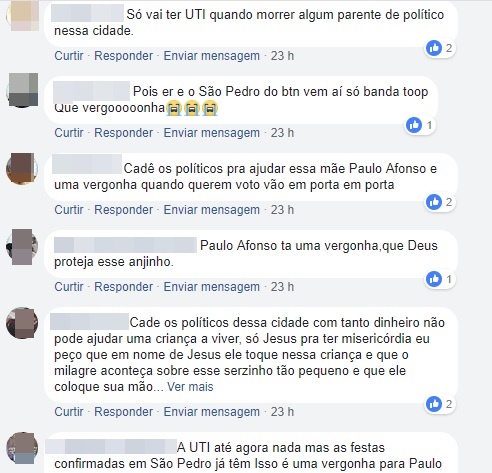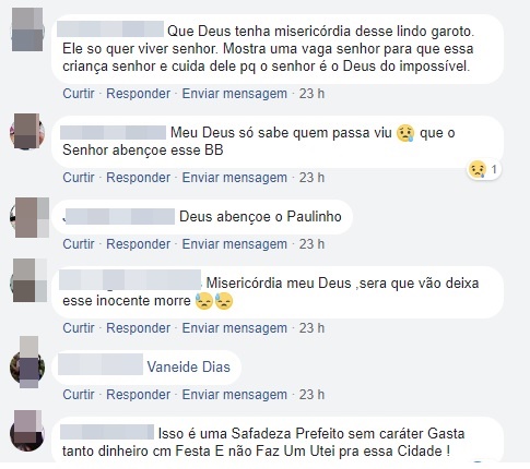 Desde a publicação da matéria (veja AQUI), um sentimento de comoção e revolta atingiu a população de Paulo Afonso. Na página oficial do site, muitos enviaram mensagens de apoio aos familiares da criança, mas houve também àqueles que se indignaram com tamanho descaso com a situação do garoto e a fragilidade do sistema público de saúde em Paulo Afonso. Outros seguidores do site disseram que estão em oração pela recuperação de Paulinho.