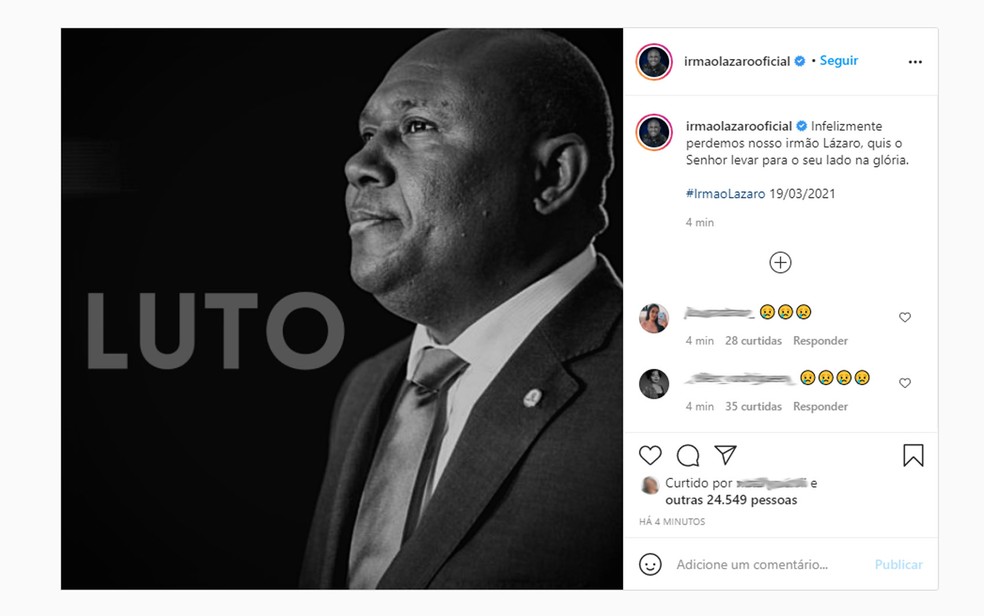 “Que triste tudo isso, gente!😞 Só essa semana foram várias perdas, algumas de pessoas tão próximas, a exemplo do nosso querido Irmão Lázaro.💔 Que Deus possa consolar e dar forças a todos os familiares e amigos que tem perdido seus entes queridos e tbm aos que estão com familiares internados travando essa batalha. Estamos no meio de uma guerra, por favor se cuidem, se protejam e se apeguem muito a Deus, pq esse negócio não é brincadeira!! @irmaolazarooficial , ainda bem que a morada é no céu, ainda bem que a morada é com Deus.🙏🏾 Descanse meu irmão.🖤 Que o Senhor Jesus abençoe a todos.🙏🏾”