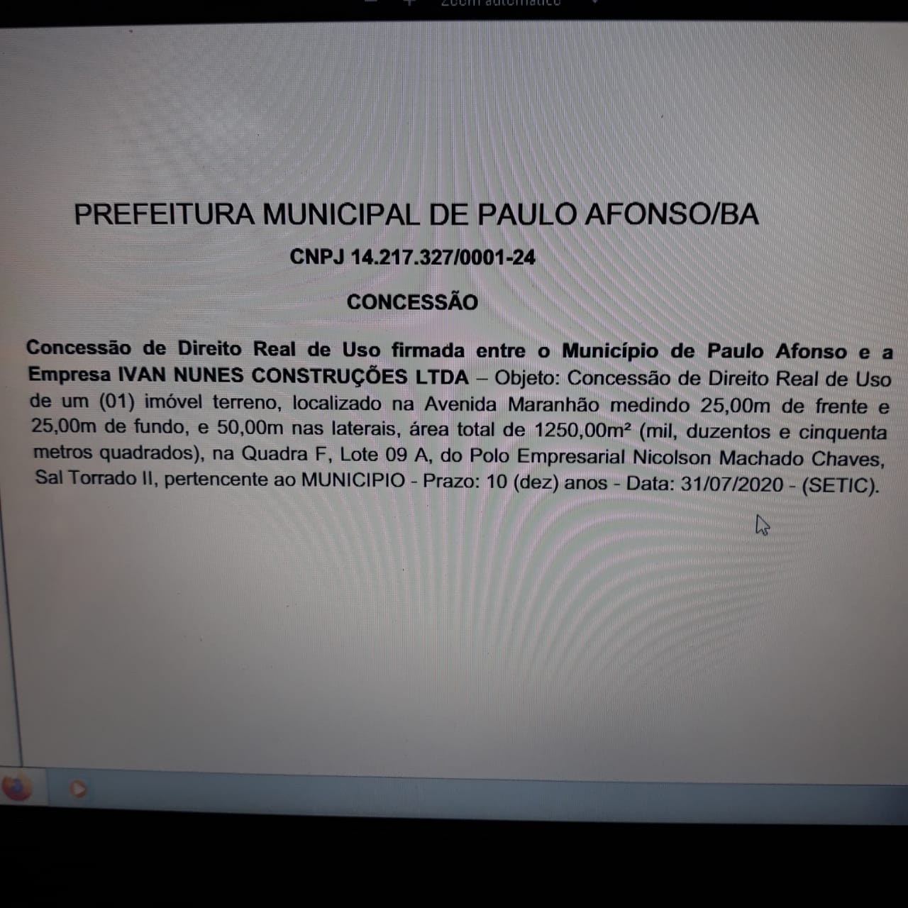Concessão de Direito Real de Uso firmada entre o Município de Paulo Afonso e a Empresa IVAN NUNES CONSTRUÇÕES LTDA – Objeto: Concessão de Direito Real de Uso de um (01) imóvel terreno, localizado na Avenida Maranhão medindo 25,00m de frente e 25,00m de fundo, e 50,00m nas laterais, área total de 1250,00m² (mil, duzentos e cinquenta metros quadrados), na Quadra F, Lote 09 A, do Polo Empresarial Nicolson Machado Chaves, Sal Torrado II, pertencente ao MUNICIPIO – Prazo: 10 (dez) anos – Data: 31/07/2020 – (SETIC).