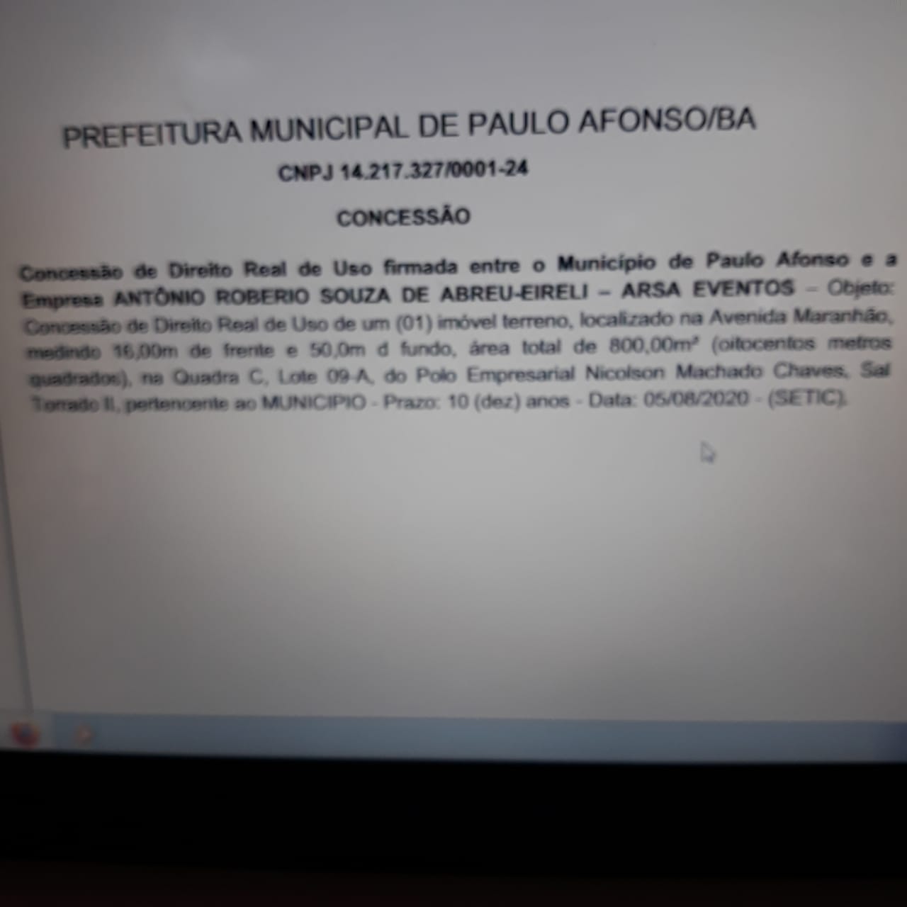 Concessão de Direito Real de Uso firmada entre o Município de Paulo Afonso e a Empresa ANTÔNIO ROBERIO SOUZA DE ABREU-EIRELI – ARSA EVENTOS – Objeto: Concessão de Direito Real de Uso de um (01) imóvel terreno, localizado na Avenida Maranhão, medindo 16,00m de frente e 50,0m d fundo, área total de 800,00m² (oitocentos metros quadrados), na Quadra C, Lote 09-A, do Polo Empresarial Nicolson Machado Chaves, Sal Torrado II, pertencente ao MUNICIPIO – Prazo: 10 (dez) anos – Data: 05/08/2020 – (SETIC).