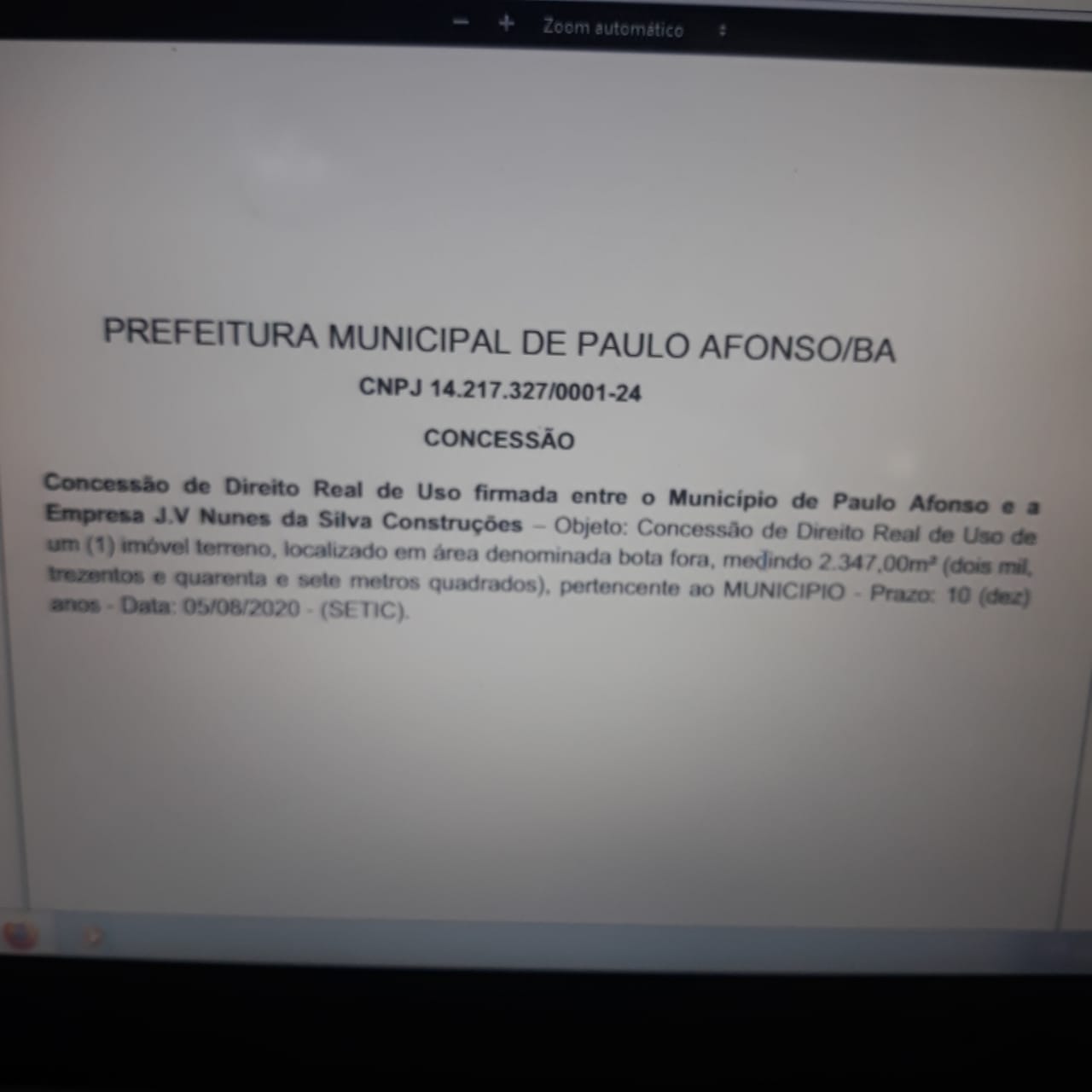 Concessão de Direito Real de Uso firmada entre o Município de Paulo Afonso e a Empresa J.V Nunes da Silva Construções – Objeto: Concessão de Direito Real de Uso de um (1) imóvel terreno, localizado em área denominada bota fora, medindo 2.347,00m² (dois mil, trezentos e quarenta e sete metros quadrados), pertencente ao MUNICIPIO – Prazo: 10 (dez) anos – Data: 05/08/2020 – (SETIC).