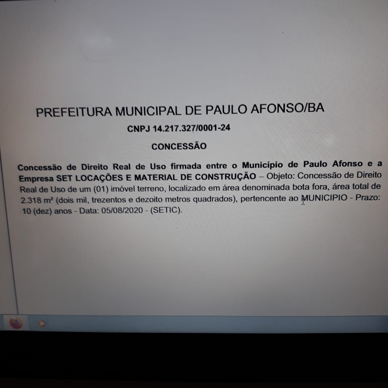Concessão de Direito Real de Uso firmada entre o Município de Paulo Afonso e a Empresa SET LOCAÇÕES E MATERIAL DE CONSTRUÇÃO – Objeto: Concessão de Direito Real de Uso de um (01) imóvel terreno, localizado em área denominada bota fora, área total de 2.318 m² (dois mil, trezentos e dezoito metros quadrados), pertencente ao MUNICIPIO – Prazo: 10 (dez) anos – Data: 05/08/2020 – (SETIC).