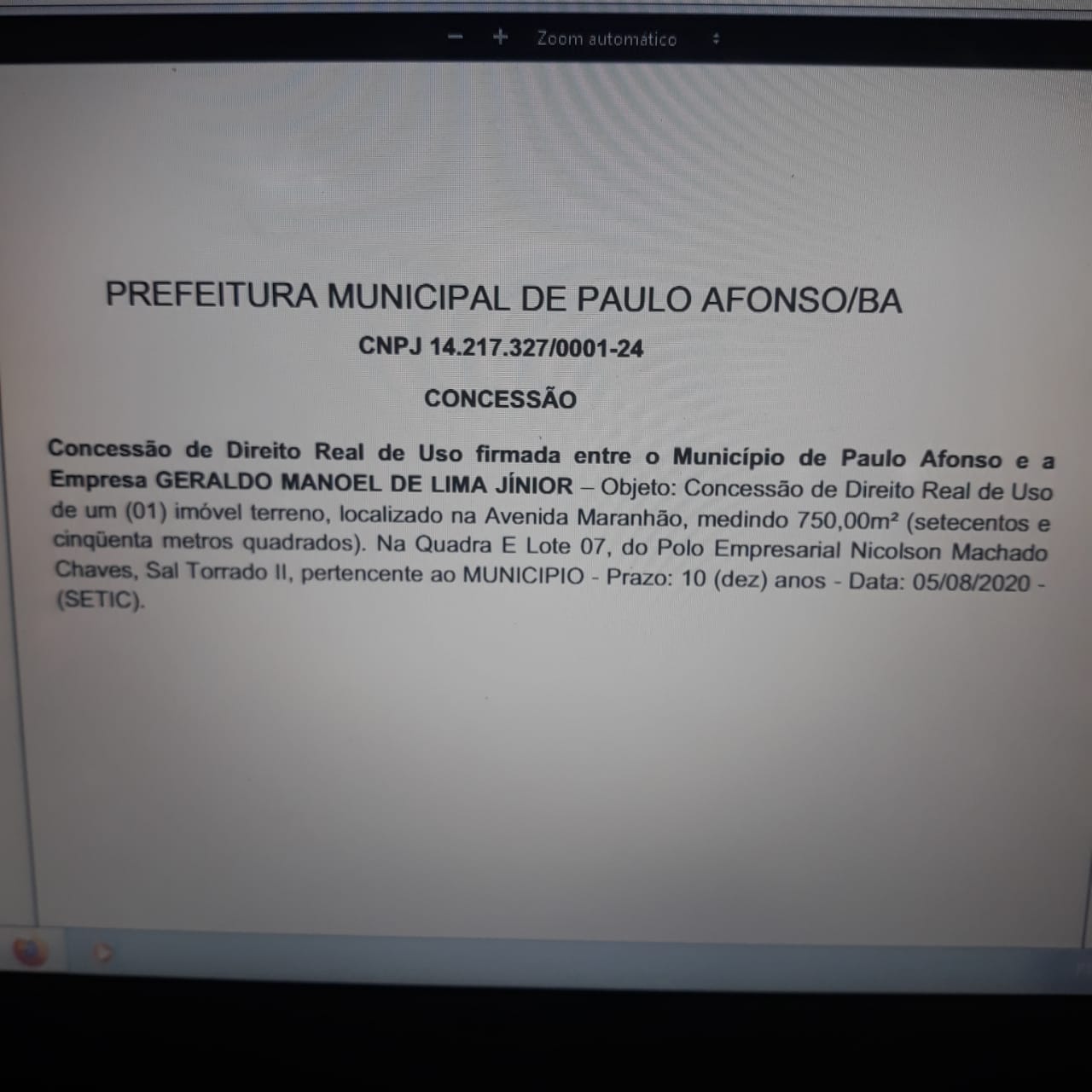 Concessão de Direito Real de Uso firmada entre o Município de Paulo Afonso e a Empresa GERALDO MANOEL DE LIMA JÚNIOR – Objeto: Concessão de Direito Real de Uso de um (01) imóvel terreno, localizado na Avenida Maranhão, medindo 750,00m² (setecentos e cinqüenta metros quadrados). Na Quadra E Lote 07, do Polo Empresarial Nicolson Machado Chaves, Sal Torrado II, pertencente ao MUNICIPIO – Prazo: 10 (dez) anos – Data: 05/08/2020 – (SETIC).
