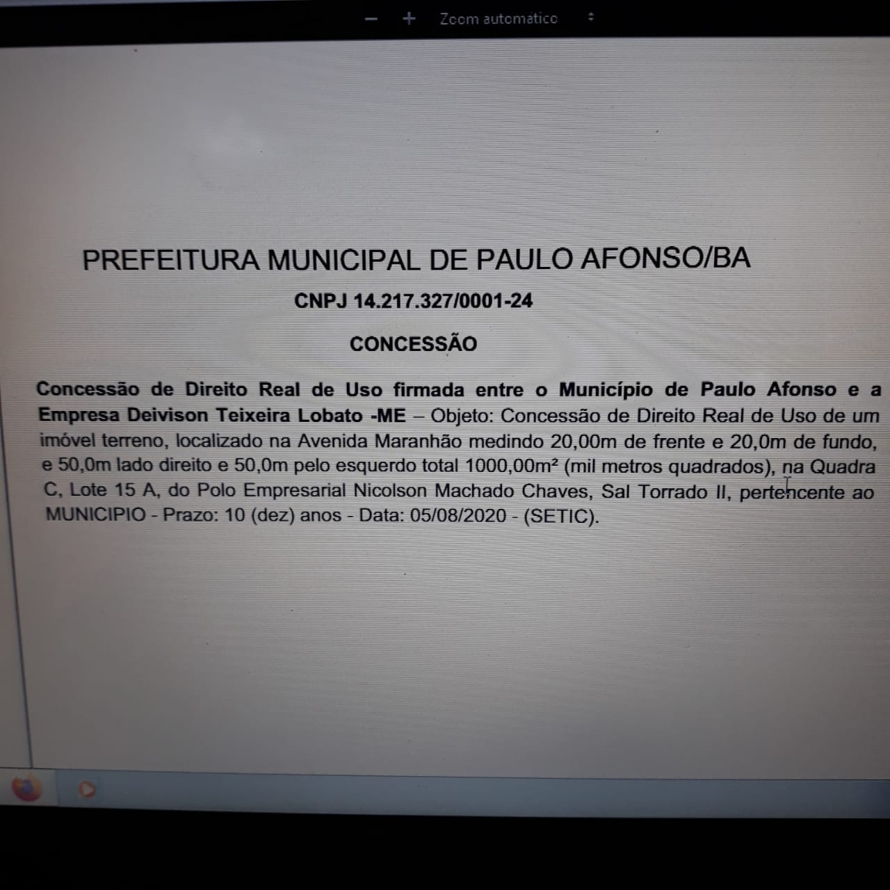 Concessão de Direito Real de Uso firmada entre o Município de Paulo Afonso e a Empresa Deivison Teixeira Lobato -ME – Objeto: Concessão de Direito Real de Uso de um imóvel terreno, localizado na Avenida Maranhão medindo 20,00m de frente e 20,0m de fundo, e 50,0m lado direito e 50,0m pelo esquerdo total 1000,00m² (mil metros quadrados), na Quadra C, Lote 15 A, do Polo Empresarial Nicolson Machado Chaves, Sal Torrado II, pertencente ao MUNICIPIO – Prazo: 10 (dez) anos – Data: 05/08/2020 – (SETIC).