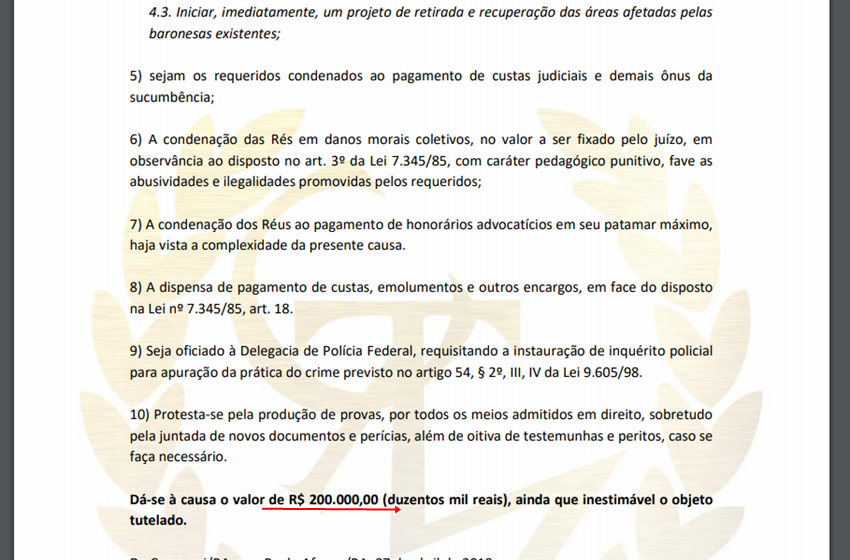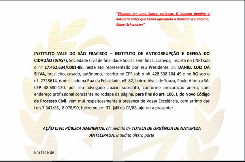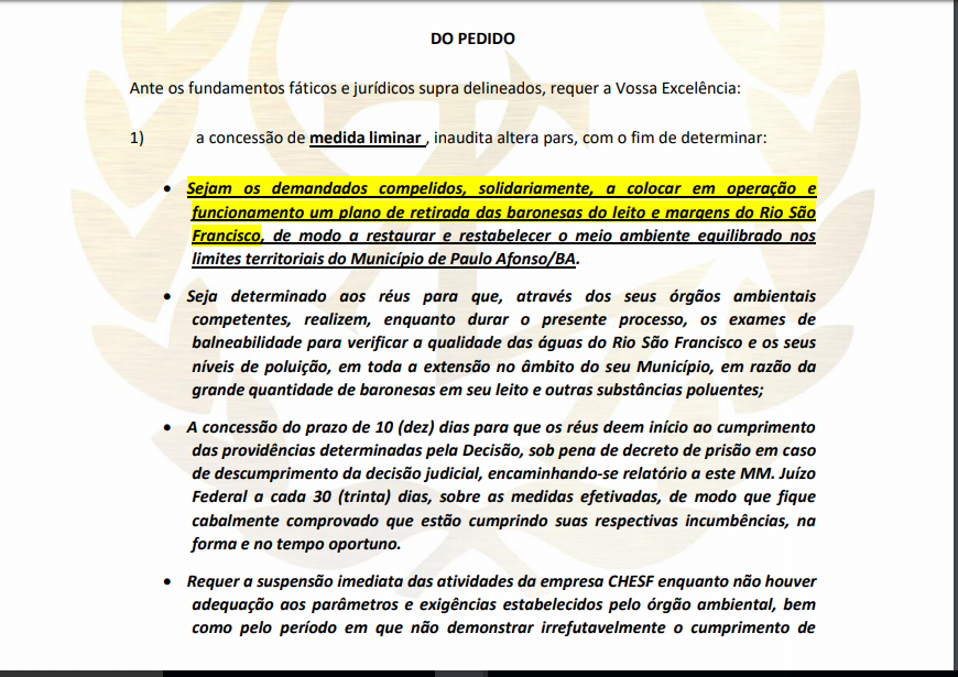 “Busca-se o devido e necessário provimento jurisdicional para a cessação de danos perpetrados contra bens da União Federal, bem como a recuperação pelos danos ecológicos já produzidos, além de almejar, também, a proteção da saúde pública e bem-estar da população. Indubitável a vocação turística que a cidade de Paulo Afonso/BA possui. Não há dúvidas também que esta cidade por muitos anos se valeu e obteve receitas oriundas das atividades comerciais desenvolvidas no entorno, no transcurso e nas margens do Rio São Francisco.