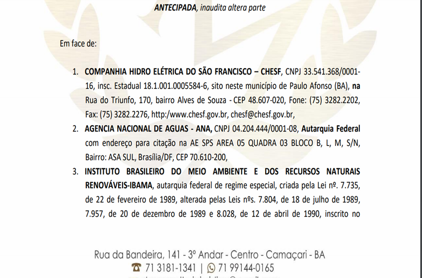 Vale registrar que a ação não mira apenas a Chesf. Estão representadas a Ana – Agência Nacional de Águas – Ibama, Funasa, prefeitura de Paulo Afonso e governo do Estado.