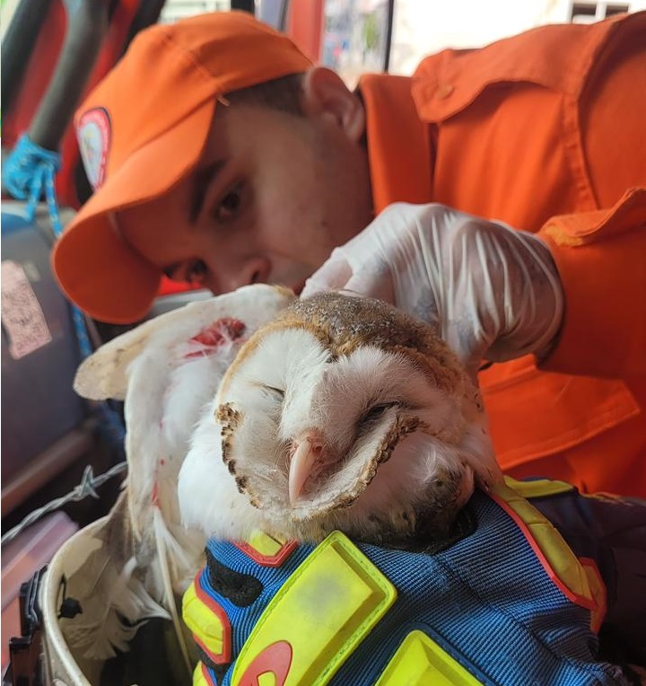O animal foi conduzido à unidade e permanece sob acompanhamento, aguardando a equipe especializada. Apesar do ferimento, a coruja apresenta-se orientada.