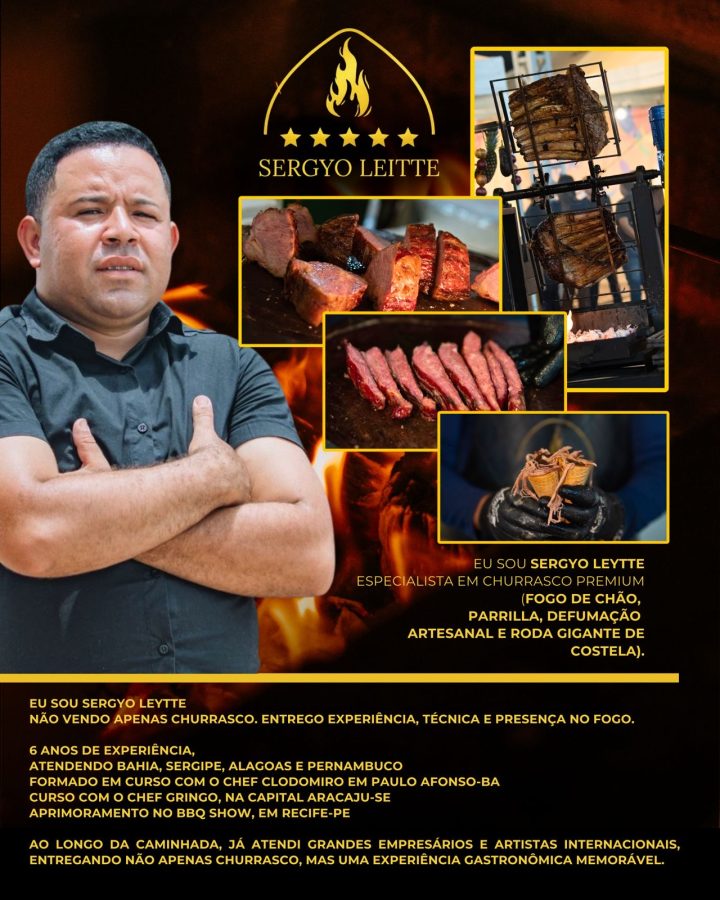 📰🔥 A trajetória do churrasqueiro Sérgio Leite, de Paulo Afonso, tem ganhado cada vez mais destaque na região Nordeste. Com muito trabalho, dedicação e fé em Deus, o profissional vem conquistando espaço nos estados da Bahia, Pernambuco, Alagoas e Sergipe, levando um churrasco de alto padrão para eventos de grande porte.