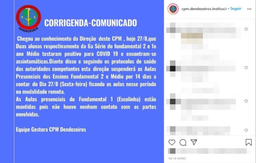 As aulas presenciais do ensino fundamental I seguem normalmente. Segundo o CPM, as atividades foram mantidas porque esses estudantes não tiveram contato com as alunas infectadas.