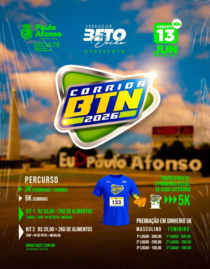 A cidade de Paulo Afonso já se prepara para mais um grande evento esportivo. Estão abertas as inscrições para a Corrida BTN 2026, que será realizada no dia 13 de junho, reunindo atletas e entusiastas da prática esportiva em um momento de incentivo à saúde, bem-estar e superação.