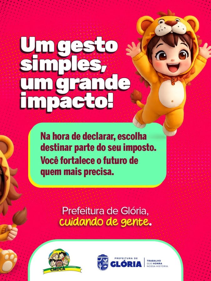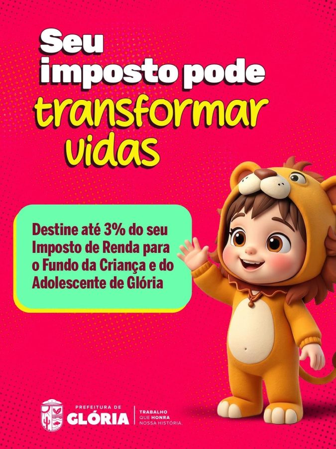 A Prefeitura Municipal de Glória reforça à população que é possível contribuir diretamente para o desenvolvimento de crianças e adolescentes do município por meio da destinação de parte do Imposto de Renda ao Fundo Municipal da Criança e do Adolescente.
