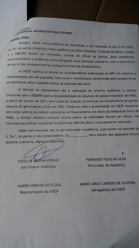 O MPF requereu à Justiça que determine à CHESF, com urgência, sob pena de multa diária de R$50 mil, a manter a prestação do serviço público de saúde no HNAS”.