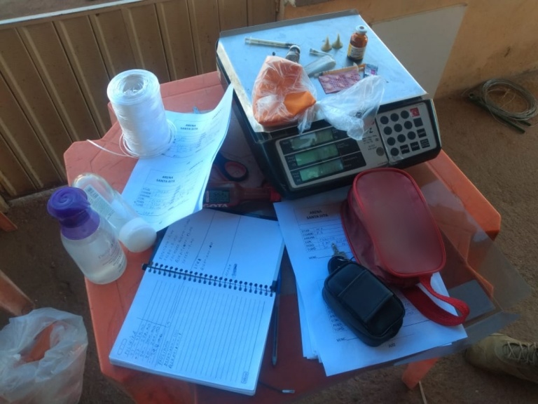 Foram apreendidos vários materiais utilizados nas rinhas como biqueiras, esporas, gaiolas, balanças, tesouras, medicamentos, cadernos com anotações e uma certa quantidade em dinheiro que estava sendo aplicado nas apostas.