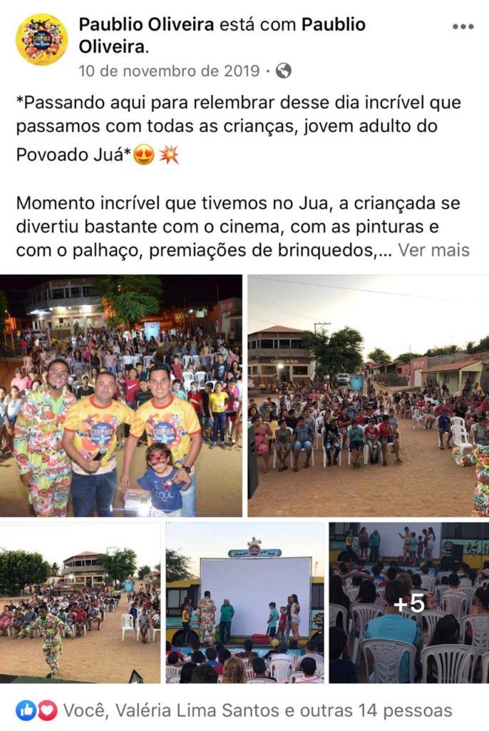 Há três anos, Paublio Oliveira realiza vários projetos sociais, o carro-chefe deles é o “Cinema nas Ruas” projeto sem fins lucrativos, que tem como público alvo as crianças e famílias mais humildes de Paulo Afonso e cidades vizinhas. O objetivo é levar diversão, cultura e arte, através de filmes exibidos em bairros e povoados, incluindo a sensibilização com temáticas como Família, Educação, Vida, Cultura e Meio Ambiente.