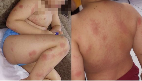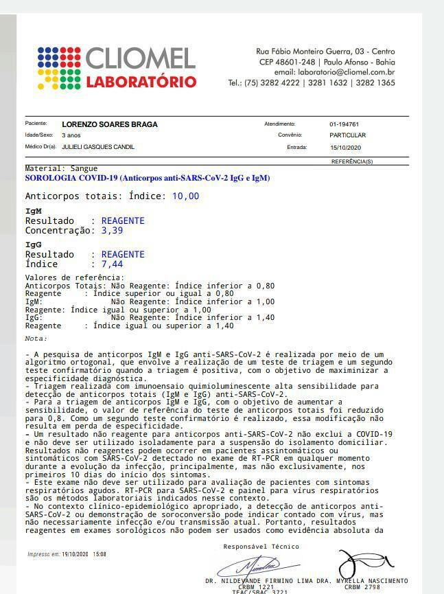 A mãe também enviou imagens do filho com os sintomas na pele ou edemas espalhados por todo o corpo, uma cópia do resultado do exame sorológico constatando ser covid e cópia do prontuário médico: