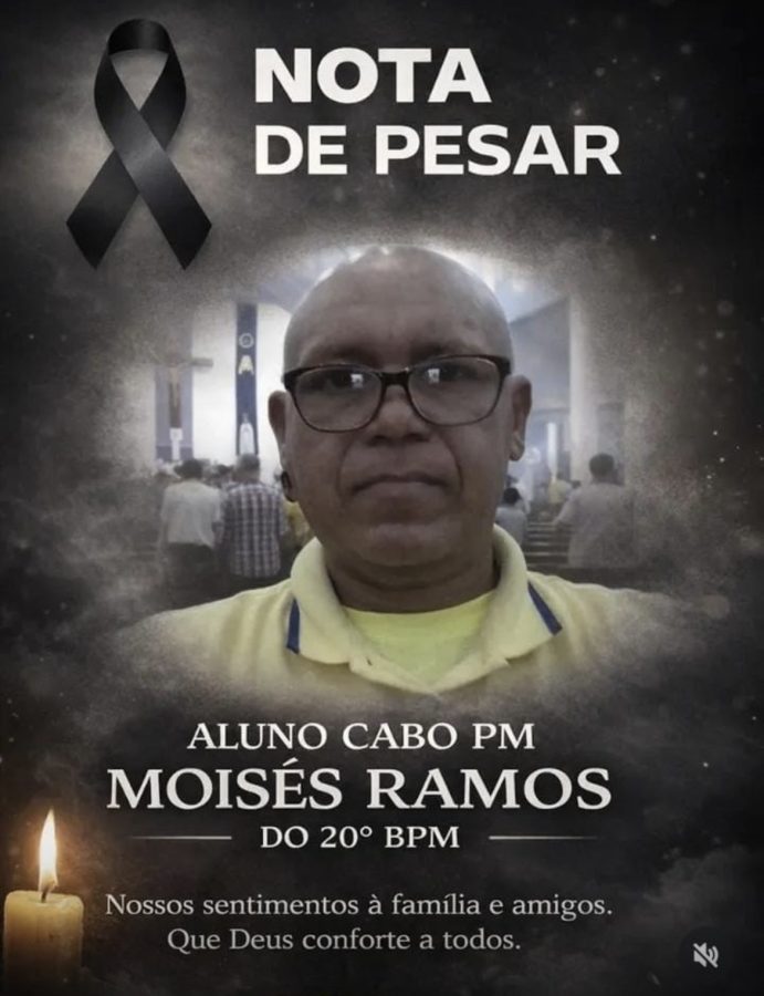 “É com imenso pesar que a Tenente-Coronel PM Emília Neta, comandante do 20º Batalhão de Polícia Militar, em nome de todo o efetivo, informa o falecimento do AL CB PM Moisés Ramos, lotado no 20º BPM. O Comando, Oficiais e Praças do 20º BPM se solidarizam com os familiares e amigos do militar, rogando a Deus que possa confortar seus corações neste momento de profunda dor e tristeza.”