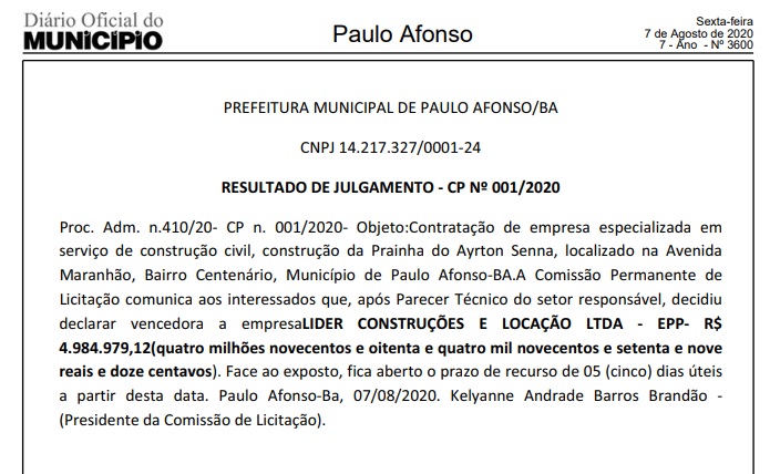 “A Comissão Permanente de Licitação comunica aos interessados que, após Parecer Técnico do setor responsável, decidiu declarar vencedora a empresa LIDER CONSTRUÇÕES E LOCAÇÃO LTDA – EPP- R$ 4.984.979,12 (quatro milhões novecentos e oitenta e quatro mil novecentos e setenta e nove reais e doze centavos).”, informa o documento.