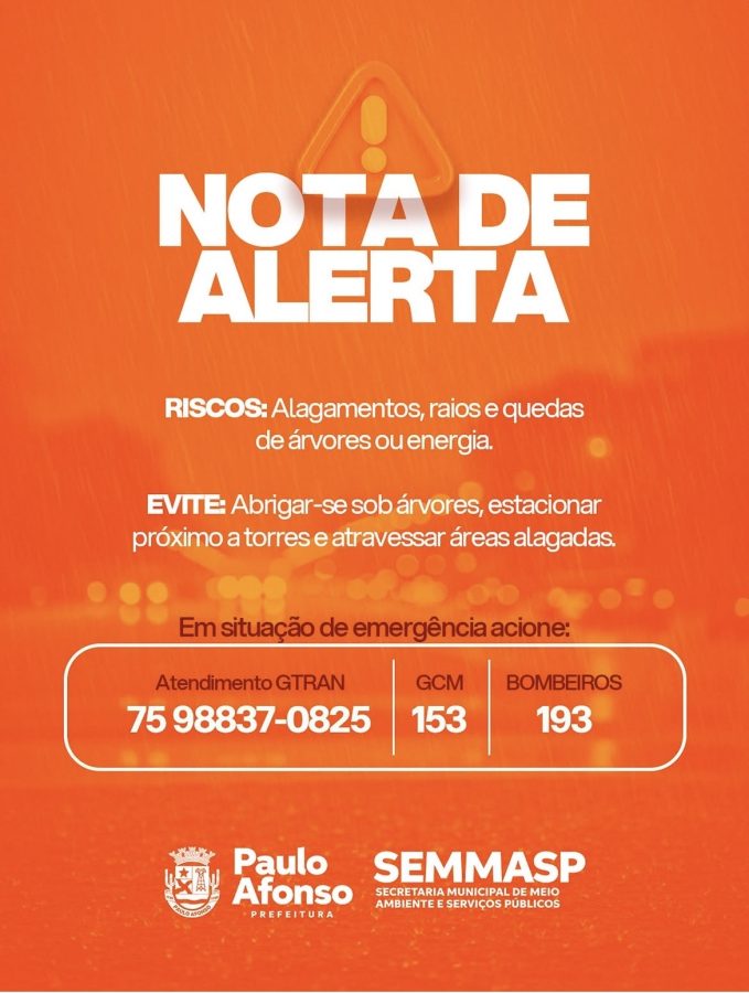 A Prefeitura de Paulo Afonso divulgou nesta quinta-feira (26) uma nota de alerta orientando a população sobre os riscos provocados pelas chuvas intensas no município. O comunicado reforça a necessidade de atenção redobrada diante da possibilidade de alagamentos, descargas elétricas, quedas de árvores e interrupções no fornecimento de energia.