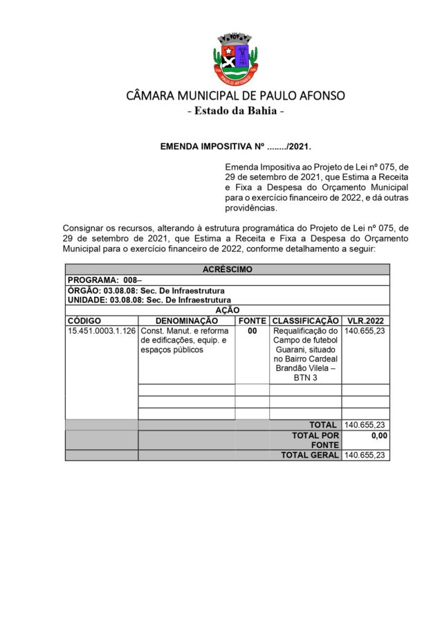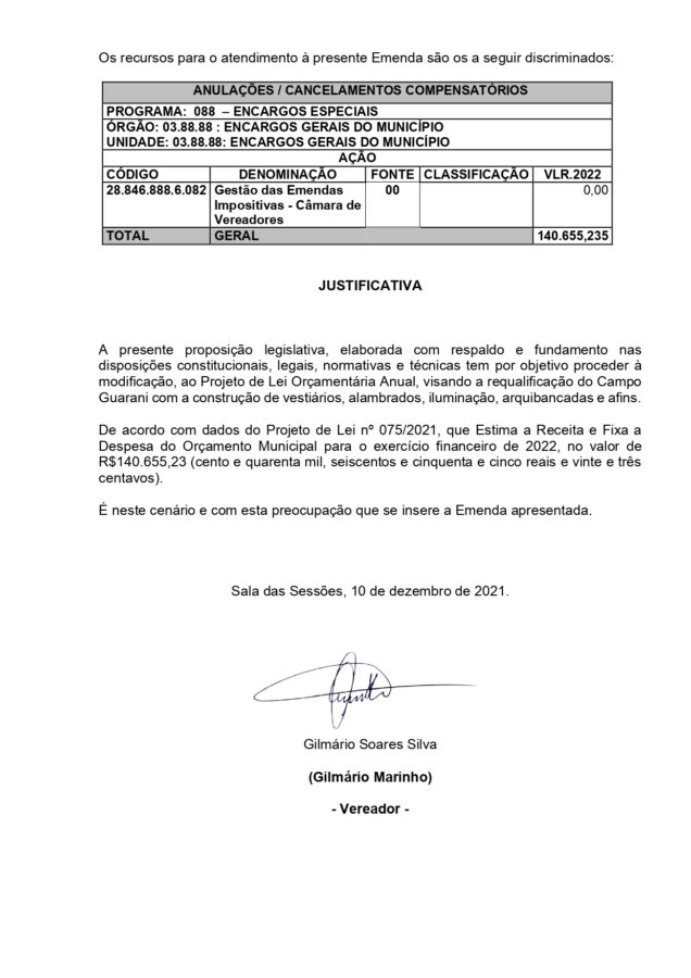 Essa é a segunda emenda impositiva do vereador Gilmario Marinho nesse ano de 2021, o vereador explicou a importância dessas emendas: “As emendas impositivas nos trazem mais segurança quanto a sua execução, o prefeito é obrigado a cumprir e não esperamos menos do que isso. Espero que ele olhe com carinho para o Projeto SUPERAÇÃO e para o campo do Guarani, o benefício é para o povo, não para o vereador Gilmario Marinho.”
