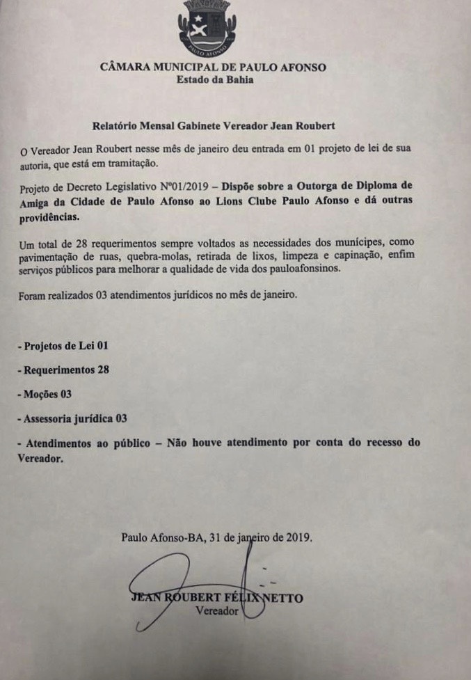 E mais: 3 atendimentos jurídicos, 3 moções e o Projeto de Decreto Legislativo nº 01/2019 – que dispõe sobre a Outorga de Diploma de Amiga da Cidade de Paulo Afonso ao Lions Clube de Paulo Afonso.