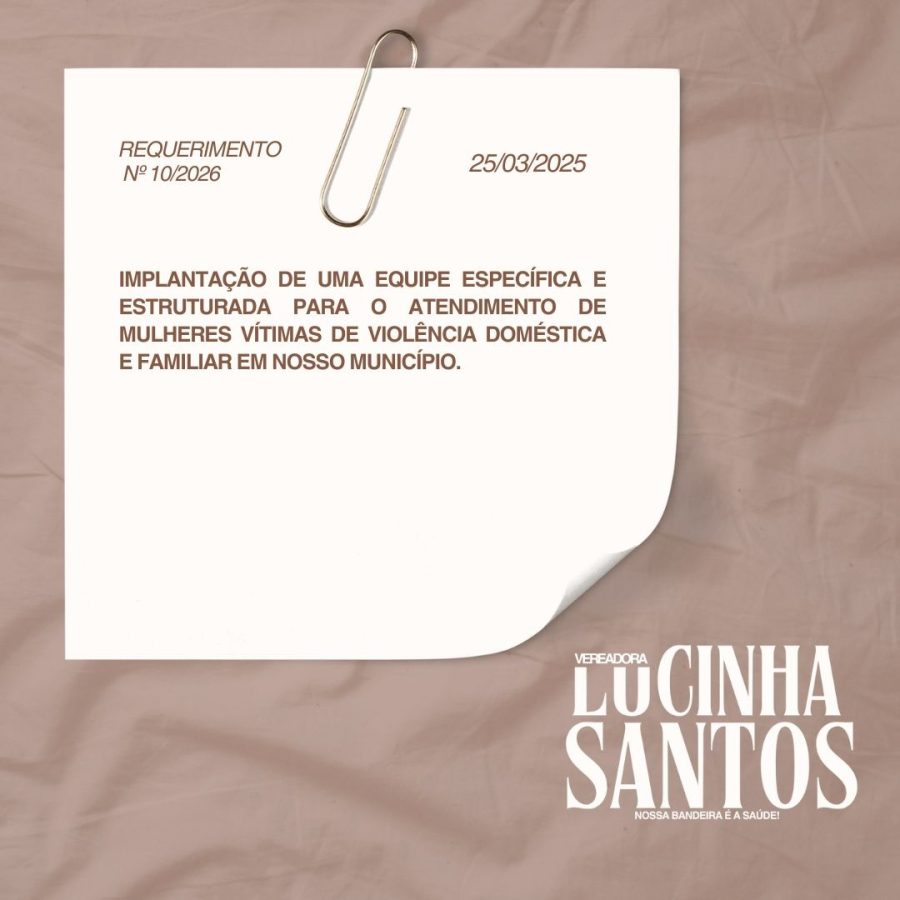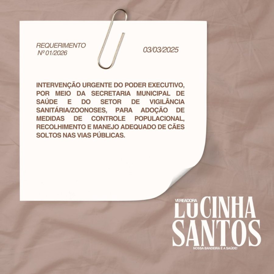 Lucinha Santos também tem se destacado pela apresentação de requerimentos voltados a questões sensíveis do município. Um dos mais recentes é o Requerimento nº 01/2026, apresentado em 3 de março, que solicita intervenção urgente do Poder Executivo, por meio da Secretaria Municipal de Saúde e da Vigilância Sanitária/Zoonoses, para adoção de medidas de controle populacional, recolhimento e manejo adequado de cães soltos nas vias públicas.