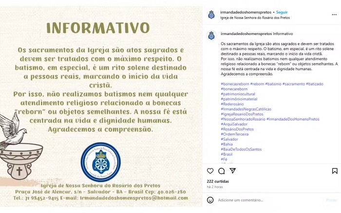 “Os sacramentos da Igreja são atos sagrados e devem ser tratados com o máximo respeito. O batismo, em especial, é um rito solene destinado a pessoas reais, marcando o início da vida cristã. Por isso, não realizamos batismos nem qualquer atendimento religioso relacionado a bonecas ‘reborn’ ou objetos semelhantes. A nossa fé está centrada na vida e dignidade humanas. Agradecemos a compreensão”, diz o comunicado publicado nas redes sociais da igreja.