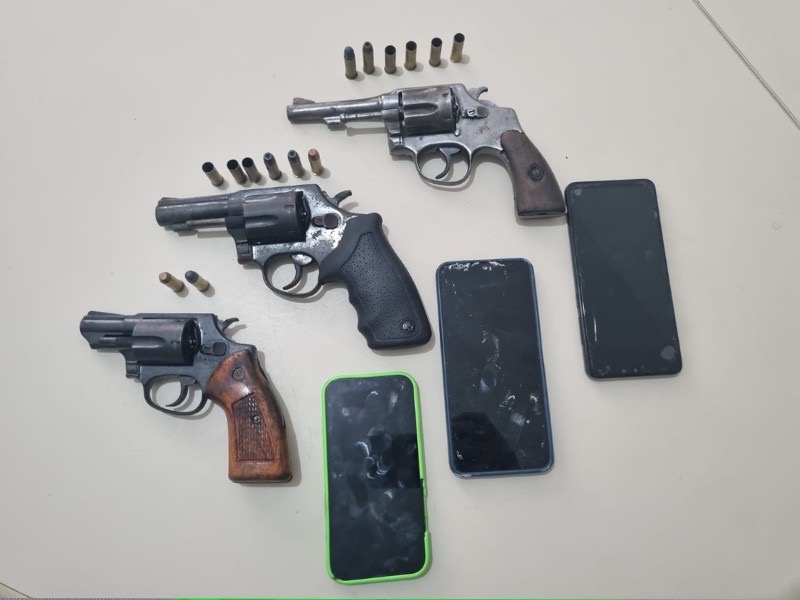 Na operação, foram apreendidos três revólveres calibre .38, munições intactas e deflagradas, dois celulares iPhone, um Samsung e um Xiaomi.
