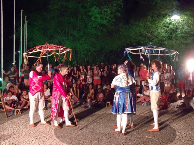 Tá. Era bacana a dinâmica das cenas e tal, os adereços, o capricho dos figurinos e maquiagem, o charme da trilha sonora feita ali, ao vivo… Tudo bastante interessante, tirando só o fato d’eu ter ficado um pouco perdido no entendimento do modo em como eles queriam contar a história de Romeu e Julieta. E mesmo que outras pessoas também tenham se sentido assim, foi bom demais ter presenciado a criançada, jovens, velhinhos, pais, mães… gente de toda as tribos atenta ao que acontecia ali na praça.