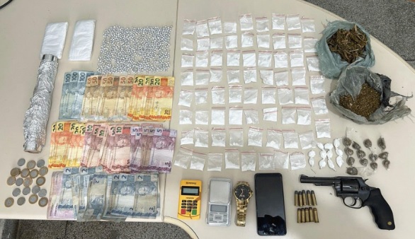 Ao se aproximarem da residência, os policiais encontraram uma pessoa no portão, que admitiu guardar drogas, uma arma de fogo e outros materiais para embalar as drogas.