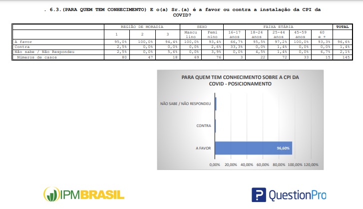 Ainda sobre a pesquisa de opinião pública realizada pelo Instituto de Pesquisas Municipais – IPM Brasil, do sociólogo José Renato Melo, para o projeto “Paulo Afonso em Debate”, tendo os primeiros dados divulgados na manhã deste domingo, 26, os entrevistados também foram questionados sobre a CPI da Covid.