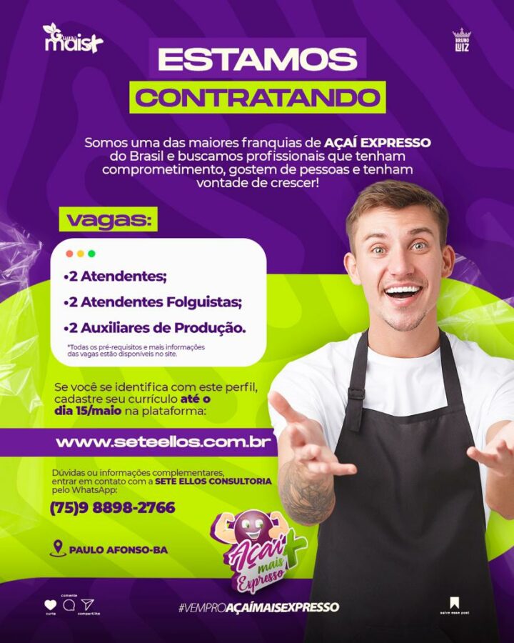 Somos uma das maiores franquias de AÇAÍ EXPRESSO do Brasil e buscamos profissionais que tenham comprometimento, gostem de pessoas e tenham vontade de crescer!