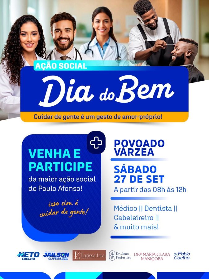 No próximo sábado, 27 de setembro, Paulo Afonso será palco de uma das maiores mobilizações sociais já realizadas no município. A iniciativa “Dia do Bem” chega ao povoado Várzea, na área rural, com a proposta de oferecer atendimentos de saúde, beleza e bem-estar de forma gratuita à população local, das 8h às 12h.