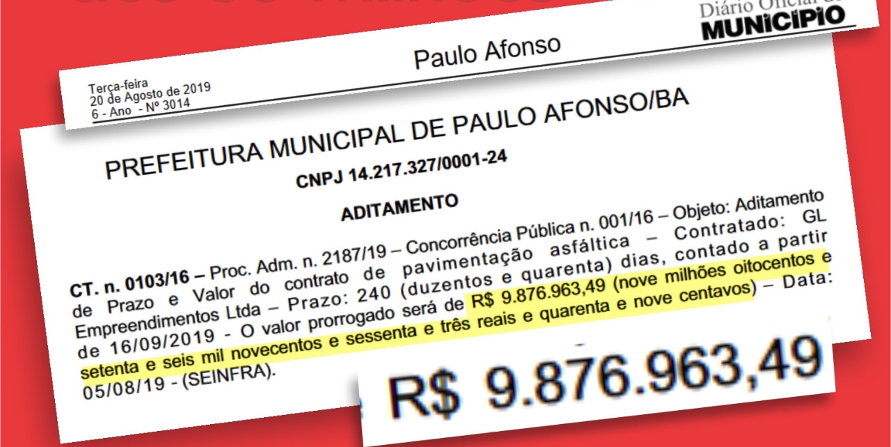 A prefeitura municipal de Paulo Afonso publicou no Diário Oficial desta terça-feira, dia 20, o aditamento de prazo e valor do contrato de pavimentação asfáltica, com a empresa GL Empreendimentos Ltda. O valor prorrogado será de R$ 9.876.963,49 e o prazo de 240 (duzentos e quarenta) dias a partir do dia 16 de setembro de 2019.