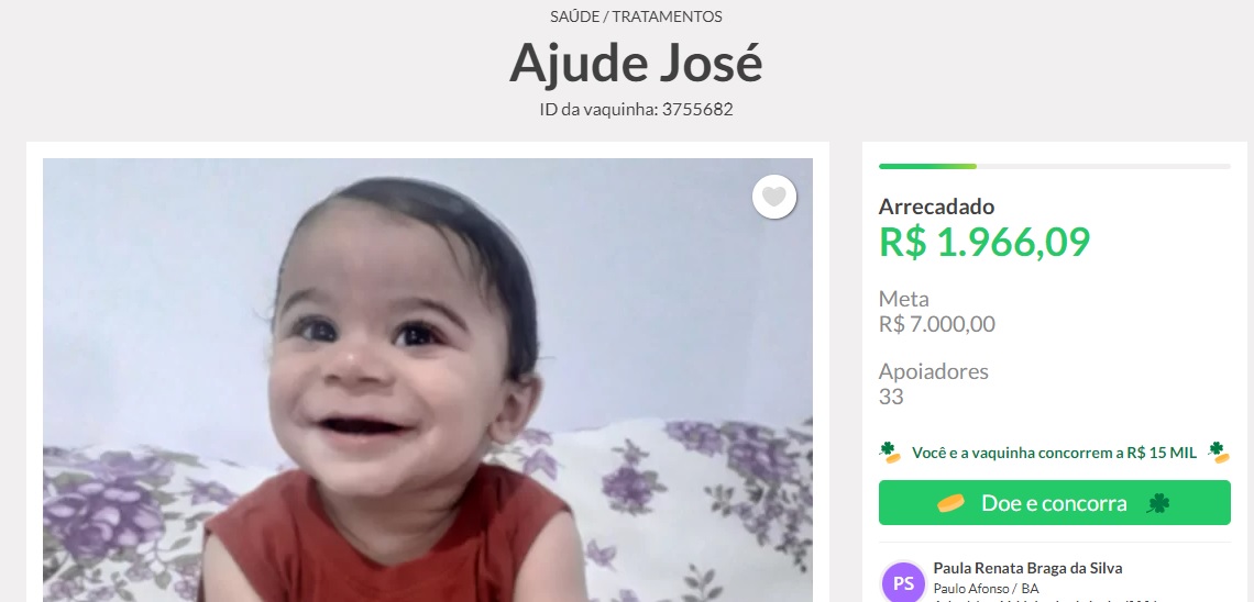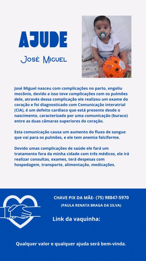 A mãe de José Miguel, Paula Renata, está fazendo uma “vaquinha” virtual para arrecadar dinheiro e ajudar no tratamento médico do filho. José Miguel necessitará sair de Paulo Afonso para se tratar com três médicos especialistas onde passará por consultas, exames e outros procedimentos.