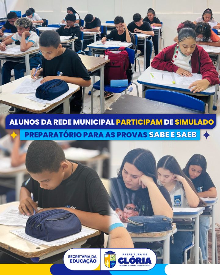 A Prefeitura Municipal de Glória, por meio da Secretaria da Educação, realizou a aplicação do 1º simulado preparatório para as avaliações SABE (Sistema de Avaliação Baiano da Educação) e SAEB (Sistema de Avaliação da Educação Básica). A iniciativa contemplou as escolas CEAF, CEMEMFS, Dionízio, Dom Mário, Alice, Cosme de Farias, Gregório e Santa Terezinha, envolvendo estudantes do 5º e 9º ano do Ensino Fundamental.