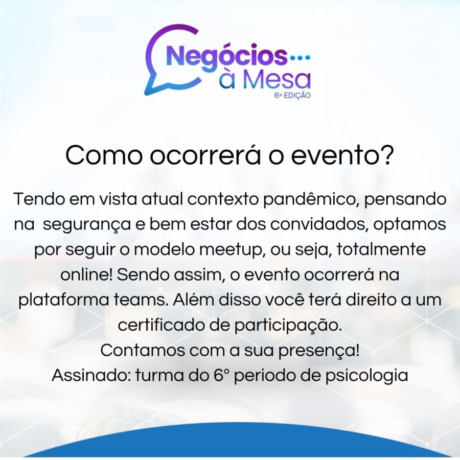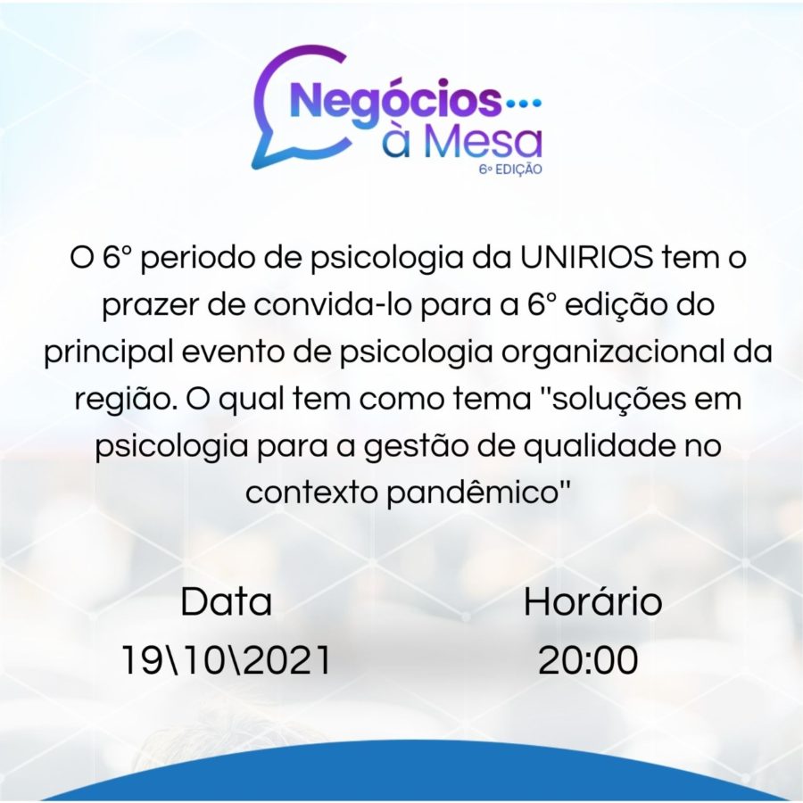 Estão abertas as inscrições para a 6ª edição do Negócios à Mesa, que acontece no dia 19/10, às 20h20min, de forma on-line. O evento organizado por acadêmicos do sexto período de Psicologia do UniRios tem como objetivo debater temas relacionados ao mundo do empreendedorismo à luz da ciência responsável pela investigação da mente e do comportamento humano.