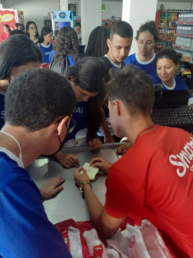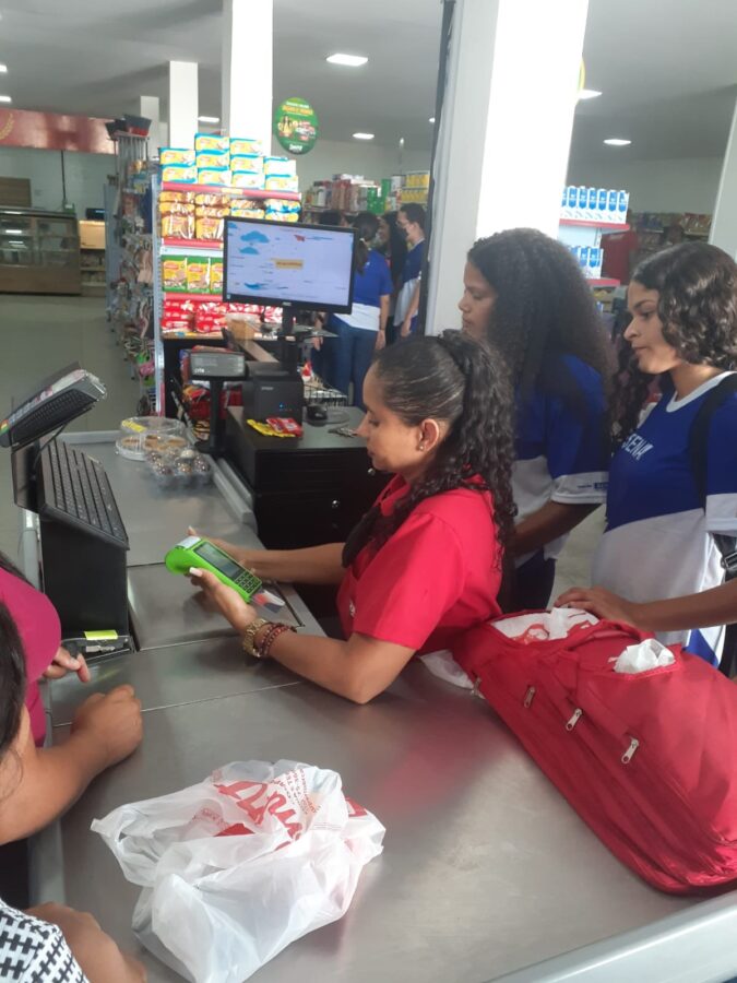 Finalizando a carga horaria de 160 horas, a visita teve como objetivo fornecer aos alunos habilidades e competências básicas para desenvolvimento das atividades de Operador de Caixa que garantam condições adequadas para a iniciação profissional no mercado de trabalho. Os jovens foram orientados pelos funcionários Gabriel Batista, operador de mercado, e Givanilda Camilo, operadora de caixa.