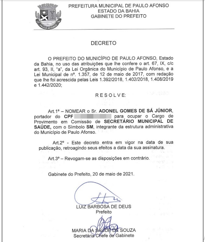 Após seis meses no cargo, o secretário interino Adonel Júnior, foi nomeado como secretário efetivo da Saúde do município de Paulo Afonso, Bahia. O decreto foi assinado no último dia 20 pelo prefeito Luiz de Deus (PSD), e publicado na sexta-feira (21) no Diário Oficial do Município.