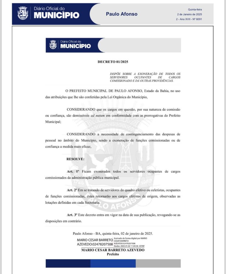 Nesta quinta-feira, 2 de janeiro, o prefeito de Paulo Afonso, Mário Galinho, assinou seu primeiro decreto, exonerando todos os ocupantes de cargos comissionados da administração municipal. O decreto, publicado no Diário Oficial do Município, faz parte de uma estratégia de contenção de despesas e reestruturação administrativa.