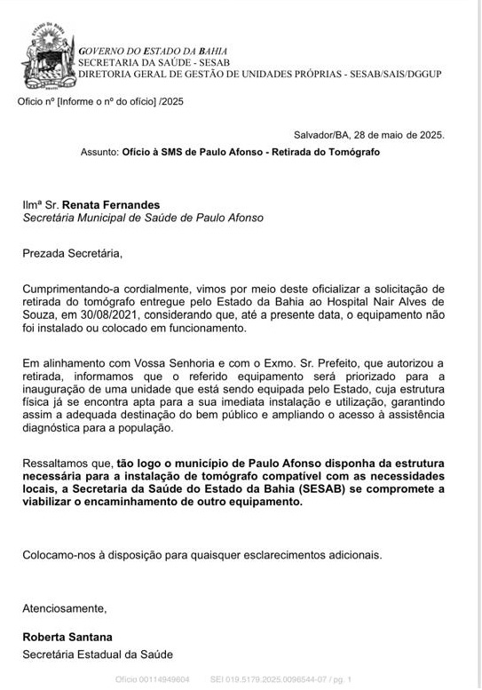 Segundo nota da Secretaria Municipal de Saúde, “a retirada do tomógrafo está sendo realizada pelo Governo do Estado da Bahia, com a devida autorização da Prefeitura de Paulo Afonso”. A medida foi oficializada por meio de ofício enviado pela Secretaria Estadual da Saúde (SESAB), assinado pela secretária Roberta Santana, em 28 de maio de 2025.