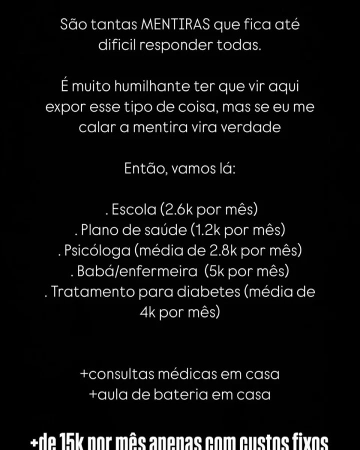 “São tantas MENTIRAS que fica até difícil responder todas. É muito humilhante ter que vir aqui expor esse tipo de coisa, mas se eu me calar, a mentira vira verdade”, afirmou o sertanejo.