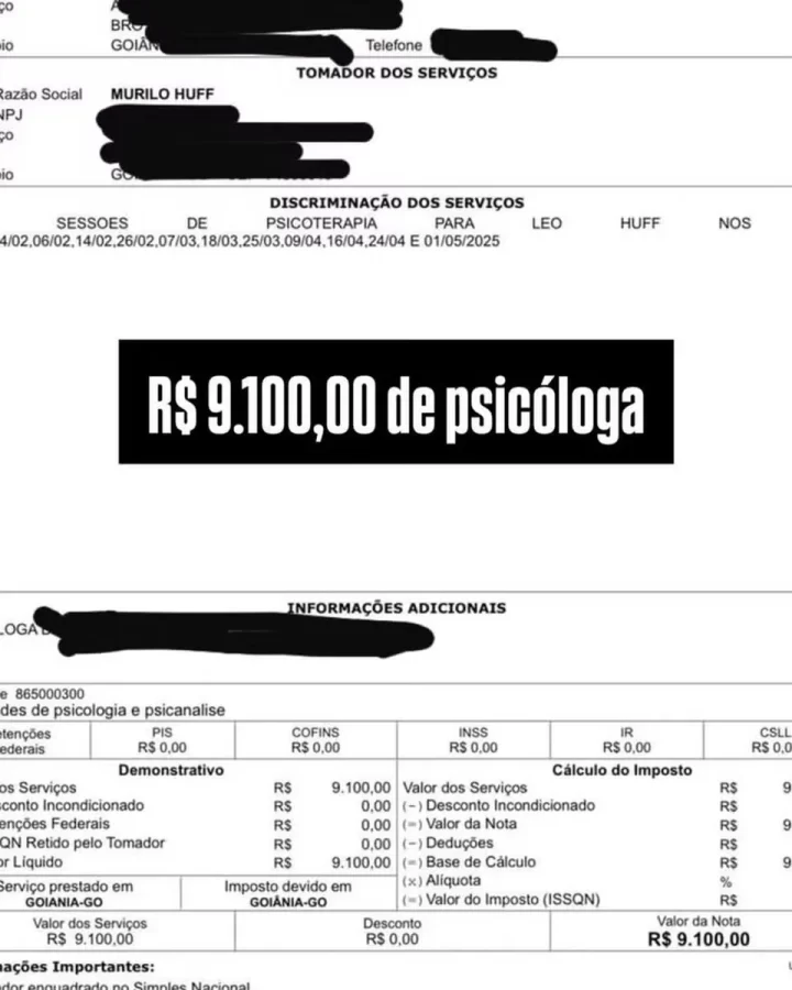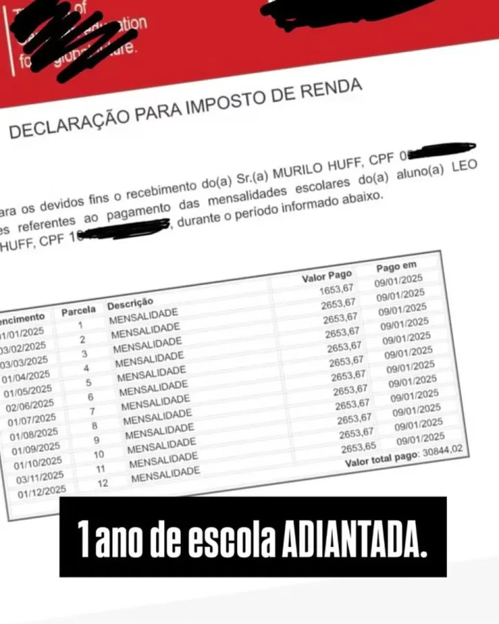 De acordo com ele, só os custos fixos básicos com Léo ultrapassam R$ 15 mil por mês, incluindo escola, plano de saúde, acompanhamento psicológico, babá enfermeira e tratamento para diabetes. Murilo ainda apresentou comprovantes, como o pagamento antecipado da anuidade escolar no valor de R$ 30 mil e notas fiscais de outros serviços.