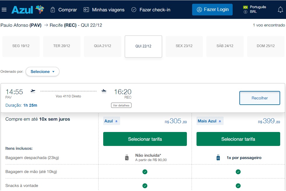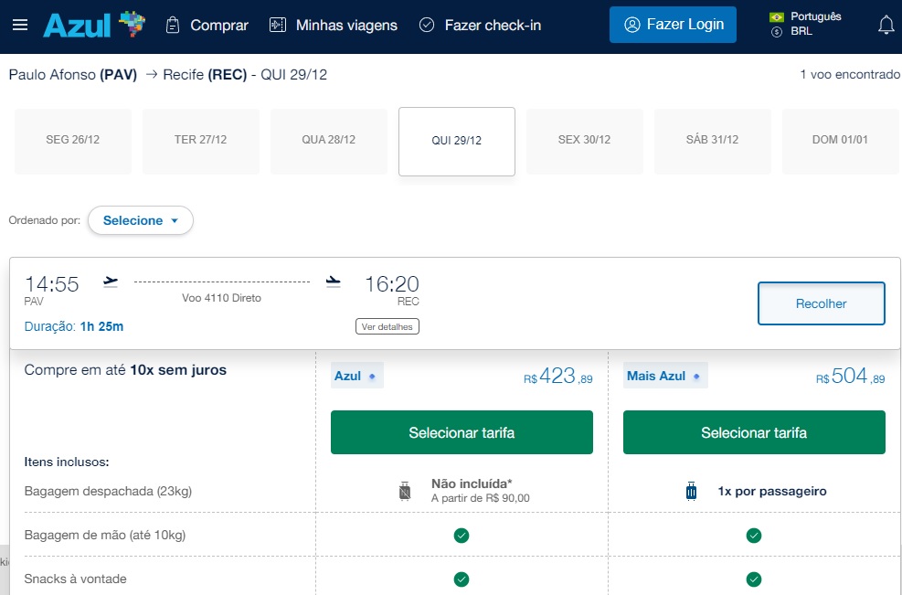 O @sitepa4 fez uma rápida consulta no site oficial da Azul nesta quarta-feira (17) sobre o valor da passagem. Para o dia 22 de dezembro (quinta-feira), de Paulo Afonso para Recife, estava em R$ 305,89 passando para R$ 399,89 com as tarifas. No dia 29 de dezembro, também numa quinta-feira e para o mesmo destino, o preço é de R$ 423,89 e R$ 504,89 (com as tarifas). Mas, atenção, os preços das passagens aéreas sofrem várias alterações — e elas não acontecem só ao longo da semana ou dos meses, mas, também, do mesmo dia.