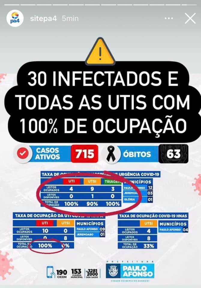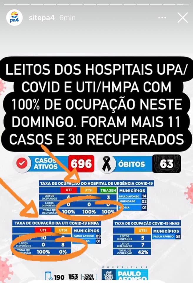 Abaixo, os boletins dos últimos dois dias mostrando a super lotação nos leitos de Paulo Afonso: