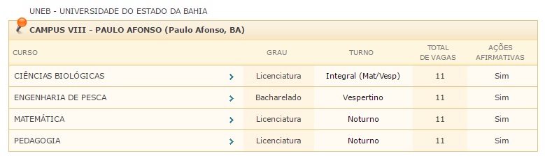 Em Paulo Afonso são 44 vagas distribuídas em quatro cursos oferecidos pela UNEB – Campus VIII conforme tabela abaixo: