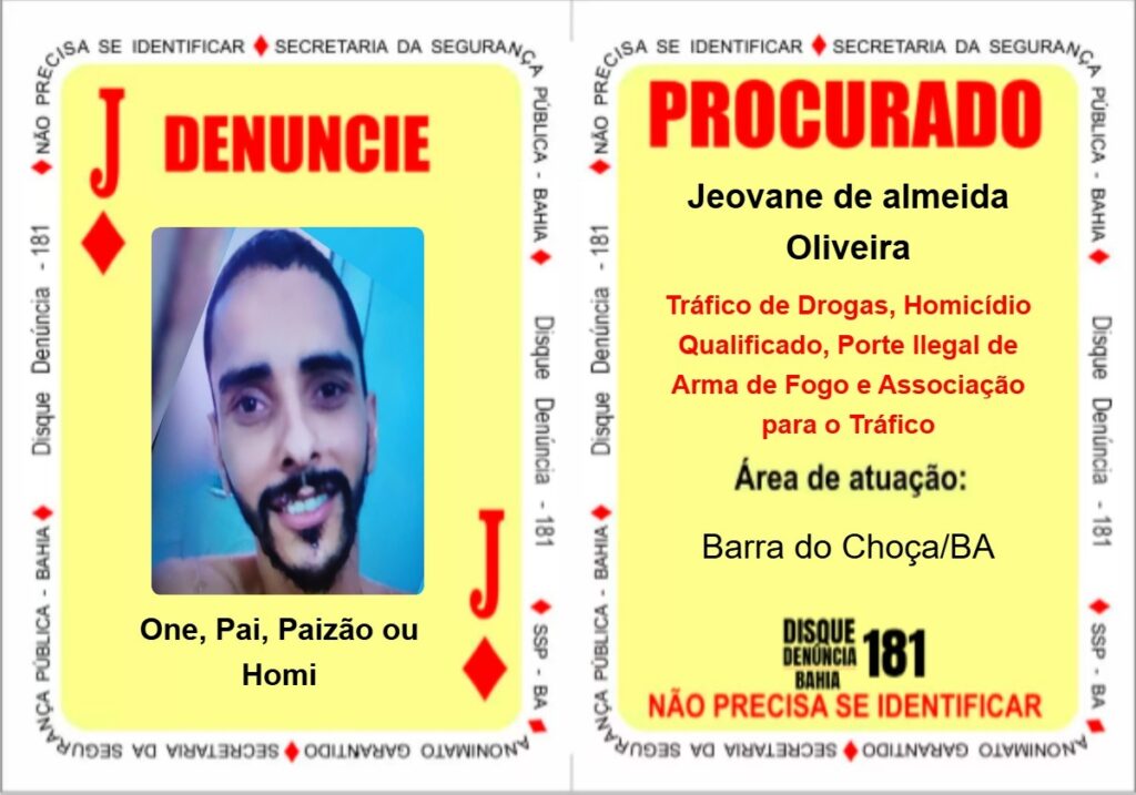 Finalizando com a carta ‘Valete de Ouros’, que passa a ser representada pelo criminoso Jeovane de Almeida Oliveira, conhecido pelos vulgos “One”, “Pai”, “Paizão” e “Homi”, que chefia uma organização criminosa em Barra do Choça, no interior da Bahia.