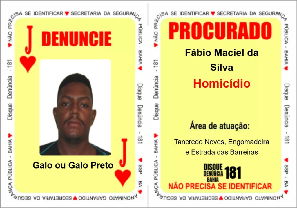 A carta ‘Valete de Copas’ passa a refletir a figura de Fábio Maciel da Silva, conhecido como ”Galo” ou “Galo Preto”, líder de uma organização criminosa que atua nos bairros de Tancredo Neves, Engomadeira e Estrada das Barreiras, na capital baiana. O foragido possui mandado por homicídio.
