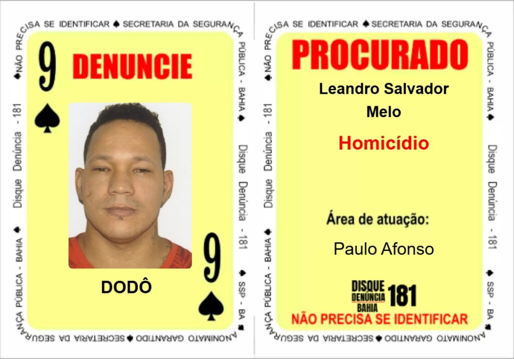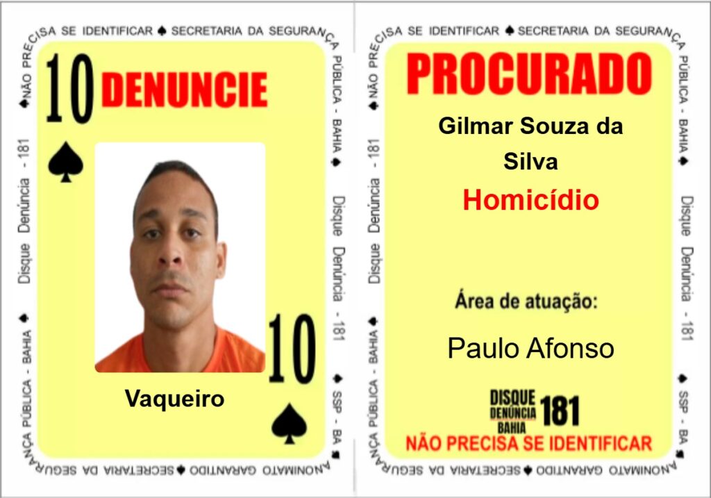 A Secretaria da Segurança Pública atualiza neste final de semana o Baralho do Crime, com cinco cartas que exibem foragidos da justiça procurados por homicídios, tráfico de drogas, associação para o tráfico de drogas, crimes de torturas e porte ilegal de armas de fogo. Dentre eles, dois criminosos são de Paulo Afonso. Os procurados foram inseridos nos naipes de Espadas, Copas e Ouros.
