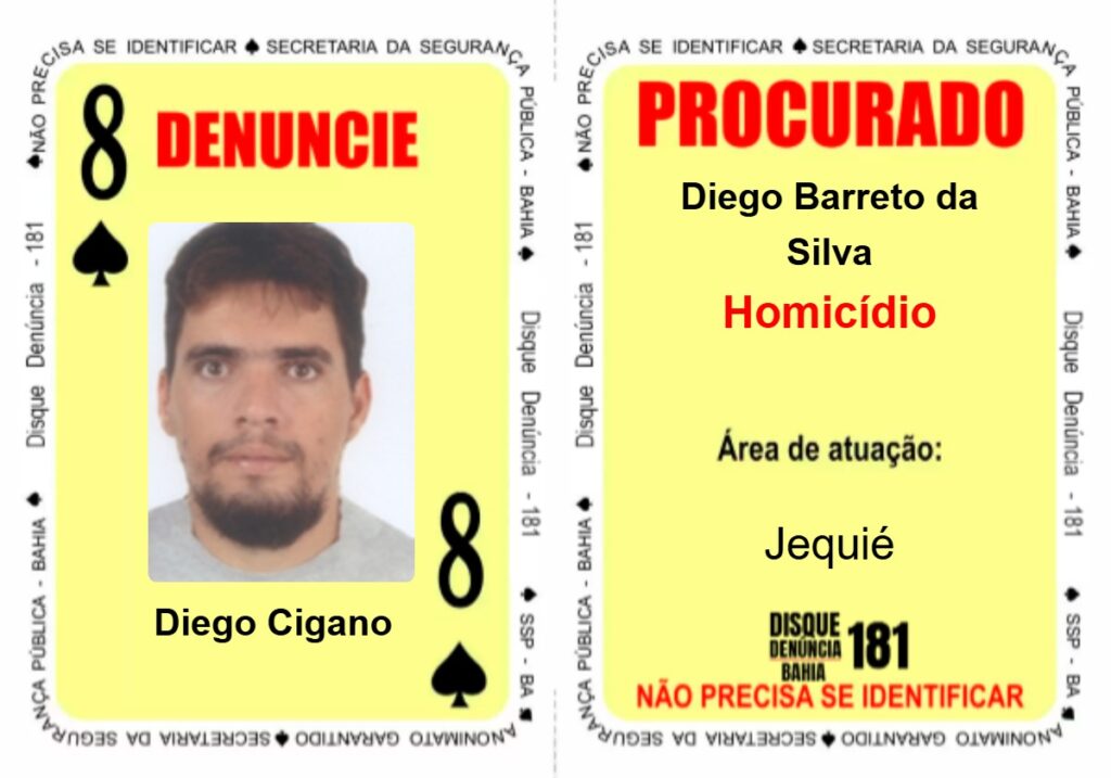 Informações sobre a localização desses foragidos e outros do Baralho do Crime, denuncie de forma anônima, gratuita e segura pelo número 181 (Disque Denúncia). Para registrar denúncia não é necessário informar dados pessoais e o número de telefone não é identificado no sistema.